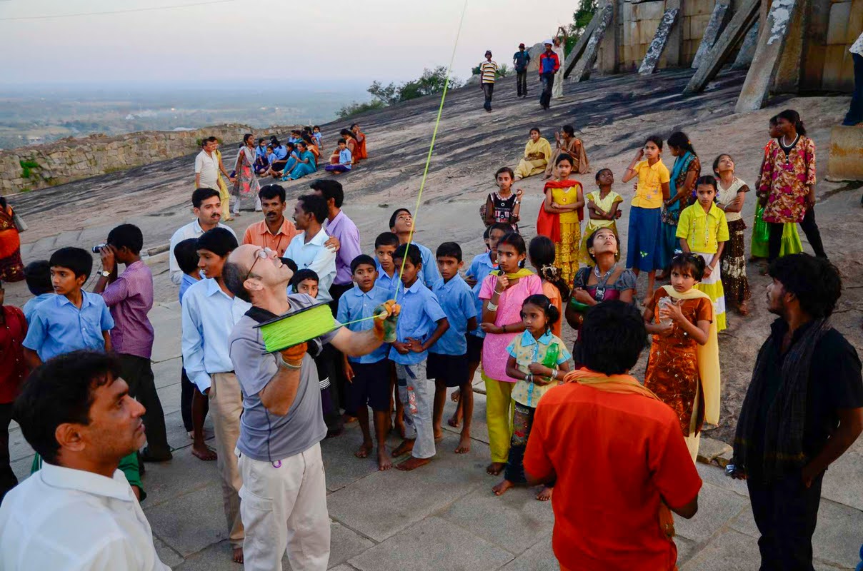 A group of kids (and a few adults) watch Nicolas fly a kite in Bangalore, India. © Amazing Aerial Agency / Nicolas Chorier