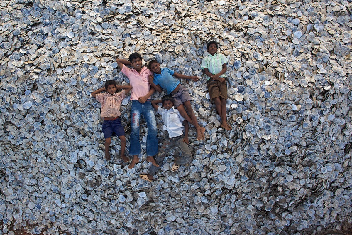 Children rest on a pile of seashells along the banks of the Yanam River. © Amazing Aerial Agency / Nicolas Chorier