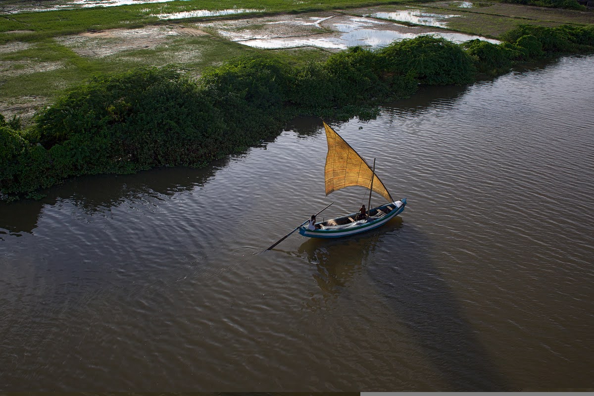 A boat sails down the Yanam River, India. © Amazing Aerial Agency / Nicolas Chorier